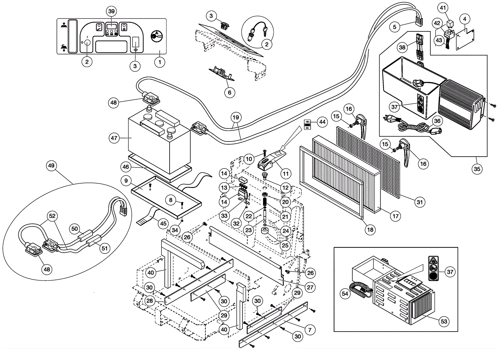 1 | 175-8036 | Control panel plate | $297.33 | 1 |  | usually ships 1-5 days | 2a | 175-7872 | Key switch with 2 keys | $53.13 | 1 |  | usually ships 1-5 days | 2b | 991-1634 | Key (pkg of 2) | $14.21 | 1 |  | ships same day | 2c | 991-5161 | Key switch with keys | $16.04 | 1 | (NON-OEM) | ships same day | 3 | 175-3762 | Bipolar switch | $49.61 | 1 |  | usually ships 10-13 days | 4 | 175-8035 | Bracket | $101.53 | 2 |  | usually ships 1-5 days | 5a | 991-2118 | Battery charger connector (black) | $11.72 | 1 |  | ships same day | 5b | 991-2117 | Battery charger connector (red) | $11.59 | 1 |  | ships same day | 6 | 175-3791 | Main circuit board | $1,633.94 | 1 |  | usually ships 10-13 days | 7 | 175-3766 | Left hand flap (gray) | $96.58 | 1 |  | usually ships 10-13 days | 8 | 999-1515 | Screw M4-.7 x 16mm flat head socket stainless steel | $0.99 | 2 |  | usually ships 1-5 days | 9 | 175-8033 | Battery tray | $219.34 | 1 |  | usually ships 1-5 days | 10 | 999-1422 | Screw M6-1 x 16mm flat head zinc plated | $2.26 | 1 |  | ships same day | 11 | 175-3770 | Filtershaker lever | $66.77 | 1 |  | usually ships 1-5 days | 12 | 175-3771 | Filtershaker rail | $83.05 | 1 |  | usually ships 1-5 days | 13 | 175-3772 | 30amp fuse | $9.13 | 3 |  | usually ships 1-5 days | 14 | 175-3773 | Fuse box and cover | $168.08 | 1 |  | usually ships 1-5 days | 15 | 999-1292 | Nut M8 hex nickel plated brass | $1.85 | 2 |  | ships same day | 16 | 175-3775 | Handle (OBSOLETE) | $64.70 | 2 |  | usually ships 10-13 days | 17a | 175-9042 | Hospital grade filter | $337.48 | 1 |  | ships same day | 17b | 991-9077 | Polyester panel filter (OBSOLETE) | $166.93 | 1 | (NON-OEM) | usually ships 7-9 days | 18 | 175-3615 | Filter gasket | $124.74 | 1 |  | ships same day | 19 | 175-3776 | Electrical insulation | $1,215.17 | 1 |  | usually ships 1-5 days | 20 | 175-3777 | Nut M18 hex | $5.50 | 1 |  | usually ships 1-5 days | 21 | 175-3778 | Spring | $27.72 | 1 |  | usually ships 1-5 days | 22 | 175-3779 | Gasket | $10.34 | 1 |  | usually ships 10-13 days | 23 | 175-3780 | Pin | $30.25 | 1 |  | usually ships 1-5 days | 24 | 175-3781 | Retaining ring | $5.50 | 1 |  | usually ships 1-5 days | 25 | 175-3782 | Filtershaker bar | $59.29 | 1 |  | usually ships 1-5 days | 26 | 999-1516 | Screw M10-1.5 x 16mm button head socket plain finish | $1.20 | 2 |  | usually ships 1-5 days | 27 | 175-3784 | Rear flap | $95.37 | 1 |  | usually ships 10-13 days | 28 | 275-5807 | Right hand flap | $95.37 | 1 |  | usually ships 10-13 days | 29a | 175-3786 | Inner flap skirt (gray) | $64.57 | 2 |  | ships same day | 29b | 175-8021 | Inner flap skirt (gray) | $93.50 | 2 | (optional color) | usually ships 10-13 days | 30 | 175-3787 | Screw M3.5 x 9.5 flat head phillips | $5.28 | 16 |  | ships same day | 31 | 203-1259 | Pre-filter | $24.20 | 1 |  | ships same day | 32 | 175-3789 | Nut M4 x .7 | $5.28 | 8 |  | usually ships 1-5 days | 33 | 175-8022 | Screw 4 x 16 | $3.70 | 2 |  | usually ships 1-5 days | 34 | 999-0740 | Nut M5-.8 hex stainless steel | $0.99 | 2 |  | ships same day | 35 | 175-8037 | 120V onboard battery charger | $1,530.43 | 1 | (includes 36-38) | usually ships 10-13 days | 36 | 475-1749 | CORD, POWER, CHRGR, 120VAC [S8-US/JP] | $60.06 | 1 |  | usually ships 10-13 days | 37 | 175-4614 | Battery charger decal | $28.49 | 1 |  | usually ships 10-13 days | 38 | 475-2134 | ADAPTER, CHARGER CONNECTOR [S8-UK] | $207.35 | 1 |  | usually ships 10-13 days | 39 | 175-3792 | Hour meter | $457.27 | 1 |  | usually ships 1-5 days | 40 | 375-9230 | Front container gasket kit (TENNANT INDSUTRIAL) | $32.34 | 1 |  | usually ships 10-13 days | 41 | 175-8024 | Relay | $163.68 | 1 |  | usually ships 10-13 days | 42 | 175-8025 | Relay mounting adapter | $47.08 | 1 |  | usually ships 1-5 days | 43 | 175-8026 | Relay wiring harness | $163.90 | 1 |  | usually ships 1-5 days | 44 | 175-8027 | Decal | $11.55 | 1 |  | usually ships 1-5 days | 45 | 175-8028 | Battery strap | $26.40 | 1 |  | usually ships 1-5 days | 46 | 175-8029 | Battery tray | $100.32 | 1 |  | usually ships 1-5 days | 47a | 162-0042 | 12V 115Ah AGM battery (Group 31) (SNSR) | $500.50 | 1 |  | ships same day | 47b | 162-0011 | 12V 105Ah wet battery (SNSR) | $291.50 | 1 |  | ships same day | 48 | 203-3138 | Electrical installation | $192.08 | 1 |  | usually ships 1-5 days | 49 | 175-3776 | Electrical insulation | $1,215.17 | 1 | (includes 48, 50-52) | usually ships 1-5 days | 50 | 991-2118 | Battery charger connector (black) | $11.72 | 1 |  | ships same day | 51 | 991-2117 | Battery charger connector (red) | $11.59 | 1 |  | ships same day | 52 | 175-8983 | Battery cable quick connect | $356.73 | 1 |  | usually ships 10-13 days | 53 | N/A | Not available | Call for price | 1 | (replaced by 35) | usually ships 3-26 days | 54 | 175-8019 | 110V main cable | $338.14 | 1 |  | usually ships 10-13 days |