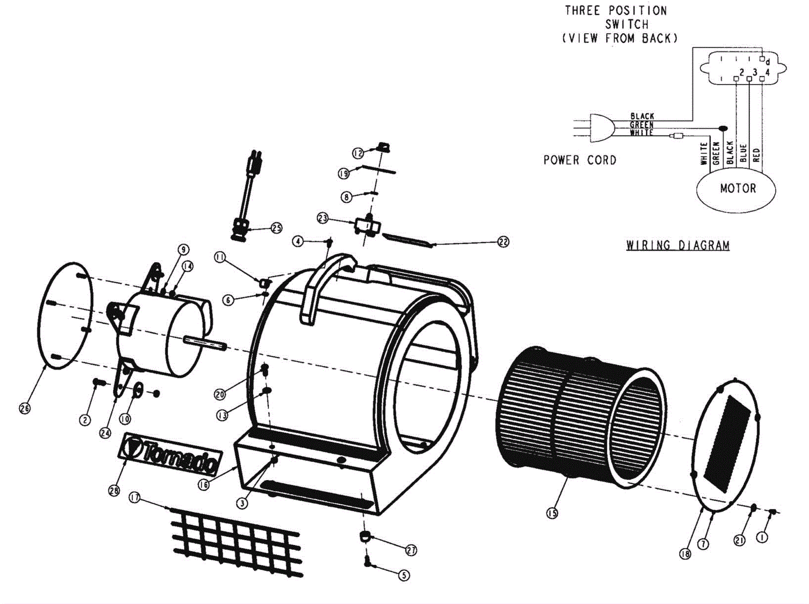 1 | 999-1505 | Screw 8-32 x 3/8 flat head phillips stainless steel | $0.99 | 4 |  | ships same day | 2 | 999-0866 | Screw 1/4-20 x 7/8 round head slotted zinc plated | $0.99 | 4 |  | ships same day | 3 | 999-0152 | Nut 1/4-20 nylon insert lock zinc plated | $0.99 | 6 |  | ships same day | 4 | 999-1174 | Screw 10-24 x 7/16 pan head phillips zinc plated | $0.99 | 1 |  | ships same day | 5 | 999-1028 | Screw 10-24 x 3/4 truss head phillips stainless steel | $1.69 | 8 |  | ships same day | 6 | 999-1068 | Nut 10-24 hex reversible lock zinc plated | $0.99 | 1 |  | ships same day | 7 | 183-4320 | Brush card pad | $1.54 | 2 |  | usually ships 14-19 days | 8 | N/A | Not available | Call for price | 1 | (obsolete) | usually ships 3-26 days | 9 | 999-0998 | Washer #10 flat stainless steel | $0.99 | 4 |  | ships same day | 10 | 999-0016 | Washer 1/4 flat plain finish | $0.99 | 4 |  | ships same day | 11 | 183-0840 | Cable clamp 5/8 | $1.54 | 1 |  | usually ships 1-5 days | 12 | 190-0258 | Switch knob | $3.95 | 1 |  | ships same day | 13 | 183-8146 | Washer 1/4 plain | $0.80 | 2 |  | ships same day | 14 | 999-0442 | Nut 10-24 nylon insert lock stainless steel | $1.76 | 8 |  | ships same day | 15 | 190-0237 | Squirrel cage with lock nut | $72.59 | 1 |  | ships same day | 16a | 183-9058 | Housing | $118.88 | 1 |  | usually ships 14-19 days | 16b | N/A | Not available | Call for price | 1 | (obsolete) | usually ships 3-26 days | 17 | 183-9052 | Grill exhaust | $12.67 | 1 |  | usually ships 14-19 days | 18 | 183-9053 | Screen intake (OBSOLETE) | $22.45 | 1 |  | usually ships 14-19 days | 19 | 183-9054 | Switch decal (Obsolete) | $5.15 | 1 |  | usually ships 14-19 days | 20 | 999-0509 | Screw 1/4-20 x 3/8 pan head phillips zinc plated | $0.99 | 2 |  | ships same day | 21 | 190-0630 | Washer | $3.95 | 4 |  | usually ships 14-18 days | 22 | 183-9055 | Warning decal | $1.98 | 1 |  | usually ships 14-19 days | 23 | 183-7483 | 3 speed rotary switch | $15.39 | 1 |  | ships same day | 25 | 183-0563 | 16/3 power cord 20 foot | $72.59 | 1 |  | usually ships 14-19 days | 26 | 183-9057 | Intake screen | $14.77 | 1 |  | usually ships 14-19 days | 27 | 183-7498 | Rubber foot (OBSOLETE) | $1.08 | 4 |  | usually ships 14-19 days | 28 | 183-0829 | Logo decal | $3.52 | 1 |  | usually ships 1-5 days | 29 | 183-0622 | 7 Inch white wire tie | $1.54 | 2 |  | usually ships 1-5 days |