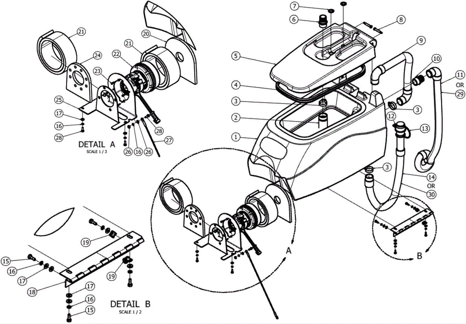 1 | 206-3439 | Recovery tank | $329.13 | 1 |  | usually ships 13-21 days | 2 | 206-3244 | Shut off float | $155.13 | 1 |  | usually ships 13-21 days | 3 | 206-0071 | Clamp | $7.23 | 3 |  | usually ships 13-21 days | 4 | 206-4027 | Lid cover gasket | $20.03 | 1 |  | usually ships 13-21 days | 5 | 206-3440 | Recovery tank cover | $57.74 | 1 |  | usually ships 13-21 days | 6 | 206-3245 | Fitting | $9.41 | 1 |  | usually ships 1-5 days | 7 | 206-4031 | Plug | $5.45 | 2 |  | usually ships 13-21 days | 8 | 206-3250 | Screw 3/8 x 1 3/4 shoulder stainless steel | $24.01 | 2 |  | usually ships 13-21 days | 9 | 206-3247 | 1 1/2 inch vacuum hose | $88.61 | 1 |  | usually ships 13-21 days | 10 | 206-3255 | Fitting | $22.60 | 1 |  | usually ships 13-21 days | 11 | 206-3441 | Squeegee hose | $100.91 | 1 |  | ships same day | 12 | 206-5485 | Hose support strap | $18.78 | 1 |  | usually ships 13-21 days | 13 | 206-6410 | Drain hose cap | $53.41 | 1 | (for hose 206-3253) | usually ships 13-21 days | 14 | 206-3253 | Drain hose assembly | $84.57 | 1 |  | ships same day | 15 | 206-1899 | Screw 1/4-20 x 3/4 hex head with patch | Call for price | 4 | (after SN 124470) | usually ships 13-21 days | 16 | 999-0060 | Washer 1/4 split lock plain finish | $0.99 | 8 |  | ships same day | 17 | 206-4820 | Washer | $3.14 | 9 |  | usually ships 13-21 days | 18 | 206-3442 | Recovery tank hinge | $49.02 | 1 |  | usually ships 13-21 days | 19 | 206-3205 | P clamp | $3.92 | 2 |  | usually ships 13-21 days | 20 | 206-4032 | Noise foam barrier | $12.99 | 1 |  | usually ships 13-21 days | 21 | 206-3446 | Noise foam | $21.90 | 2 |  | usually ships 13-21 days | 22 | 206-3443 | 24V 2 stage vacuum motor peripheral | $431.38 | 1 |  | usually ships 13-21 days | 23 | 999-0572 | Screw 10-24 x 1/2 pan head self-tapping zinc | $0.99 | 1 |  | ships same day | 24 | 206-3266 | Vacuum gasket | $10.62 | 1 |  | usually ships 13-21 days | 25 | 206-1678 | Vacuum mounting bracket | $90.59 | 1 | (after SN 124470) | usually ships 13-21 days | 26 | 999-0609 | Nut 1/4-20 hex stainless steel | $0.99 | 2 |  | ships same day | 27 | 206-4030 | Tank retention cable | $38.59 | 1 |  | usually ships 13-21 days | 28 | 999-1099 | Bolt 1/4-20 x 3/4 hex head stainless steel | $0.99 | 4 |  | ships same day | 29 | 206-4028 | Squeegee hose (chemical resistant) | $267.15 | 1 |  | usually ships 13-21 days | 30 | 206-4029 | Drain hose capped chem resist | $211.40 | 1 |  | usually ships 13-21 days | N/S | 206-3444 | Isolator mounting bracket | $26.61 | 1 | (before SN 124471) | usually ships 13-21 days | N/S | 206-3445 | Vacuum mounting cover (OBSOLETE) | $64.03 | 1 | (before SN 124471) | usually ships 1-5 days | N/S | 206-3249 | Rubber mount | $14.20 | 2 | (before SN 124471) | usually ships 13-21 days | N/S | 206-4026 | Instruction sheet (OBSOLETE) | Call for price | 1 | (included in KIT1) | usually ships 13-21 days | N/S | 206-3446 | Noise foam | $21.90 | 2 | (included in KIT1) | usually ships 13-21 days | N/S | 206-1007 | Clamp | $2.57 | 4 | (included in KIT1) | usually ships 1-5 days | N/S | 206-3266 | Vacuum gasket | $10.62 | 1 | (included in KIT1) | usually ships 13-21 days | N/S | 206-4032 | Noise foam barrier | $12.99 | 1 | (included in KIT1) | usually ships 13-21 days | KIT1 | 206-3443 | 24V 2 stage vacuum motor peripheral | $431.38 | 1 |  | usually ships 13-21 days |